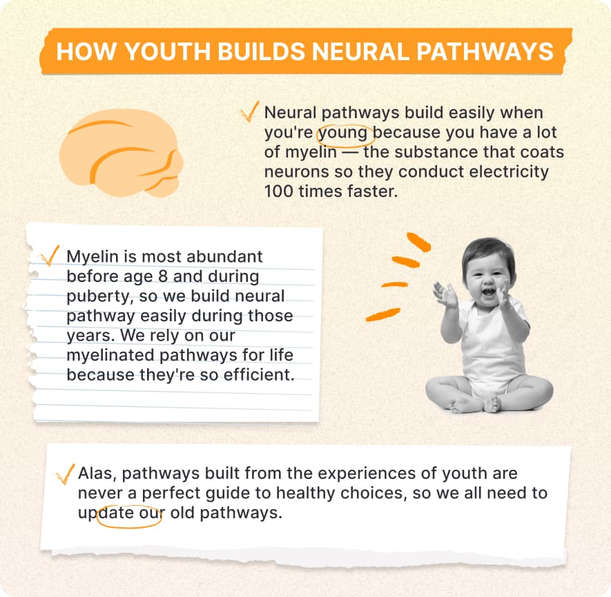 Of course, early learning can never be a perfect guide to adult life, so the other two tools are essential. But before we move on, let’s honor our myelinated pathways. You may think it’s somehow shameful to run on old pathways. You may think you’ve deleted your childhood experience and learned everything after you left home. But that’s just not how your brain works. Millions of years of evolution allowed us to wire up in youth instead of being pre-wired for a single ecological niche. We are not designed to delete the neural network we built in youth. We are designed to use it.